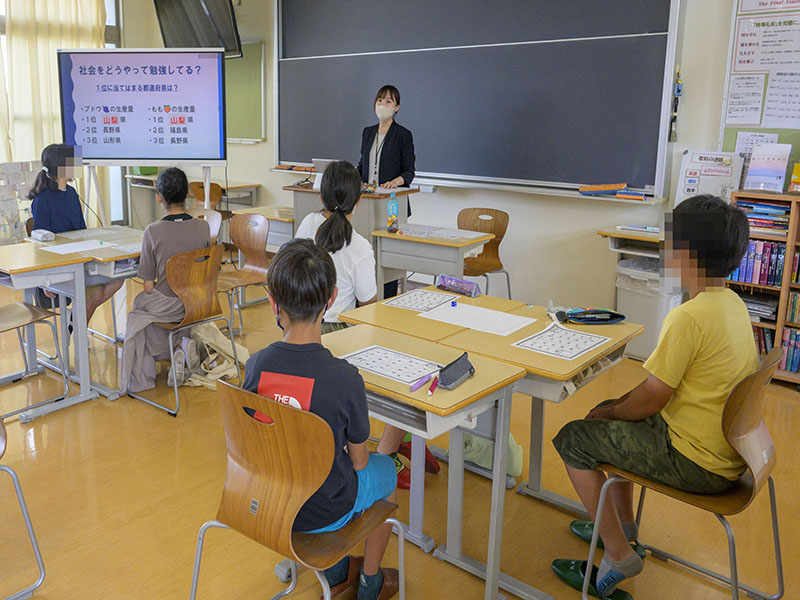 社会では、実際の問題を通して日本の特産品の学習や世界の様子を見る授業を実施していました。