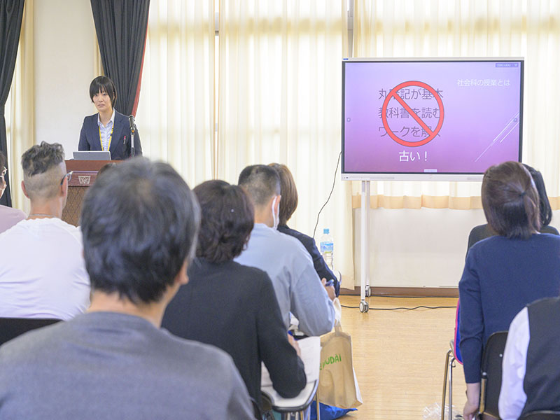最後に、実際のエンゲージメントが高い授業の1つとして、社会科の後藤より社会の授業を映像を通して説明がありました。生徒が主体となって学習に取り組み、知的好奇心をくすぐるような授業を展開する本校の授業の特色を大きく活かした授業の説明でした。特に生徒の3ヶ月の成長をおさめた様子の動画も含まれており、非常に興味深い内容でした。