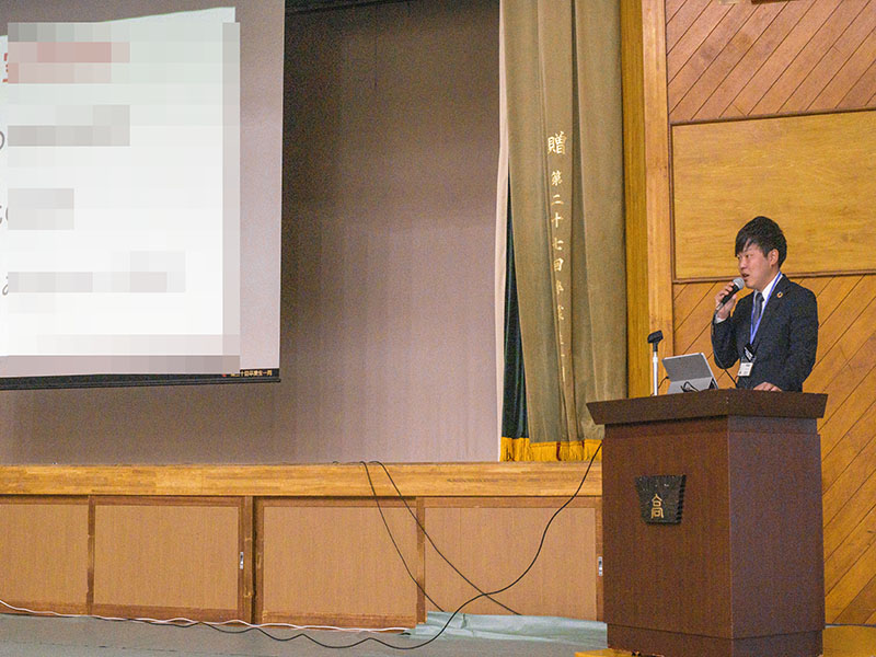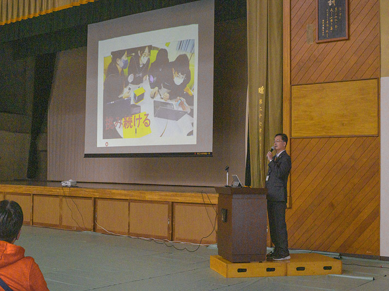 副校長挨拶の様子。本校の教育ビジョンや先日実施されたプログラミング教室の様子について説明がありました。