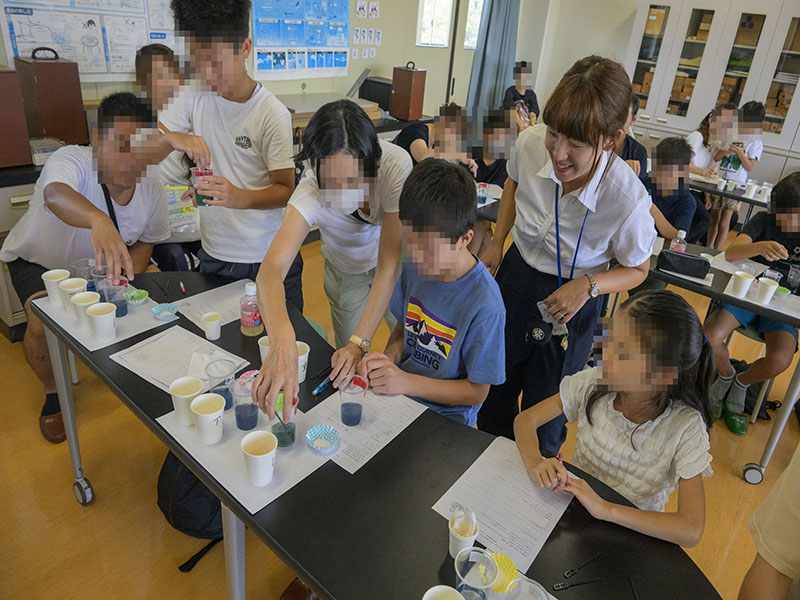 理科では、バタフライピーティーを活用して液性による色の変化を学習していました。目の前で起こる色の変化に驚きつつも、楽しんでいる姿が見られました。