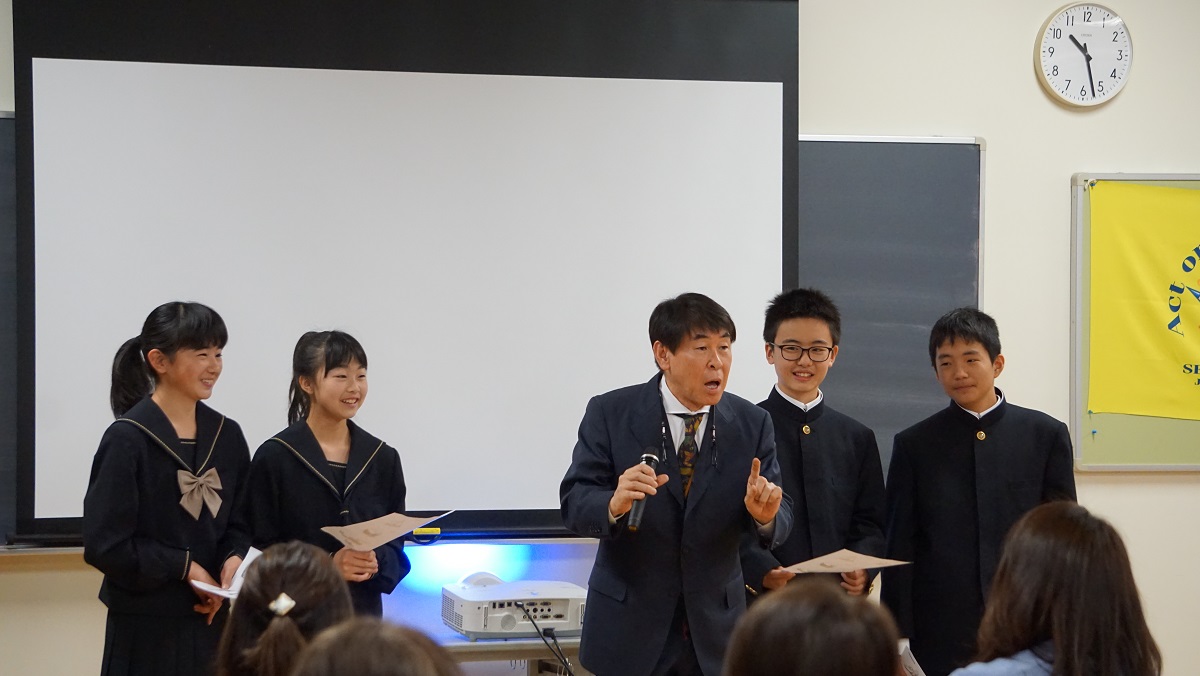 続いて、主幹教諭であり本校英語科を担当する仲丸と、本校在校生が、英語の発音の授業を実際に披露しました。