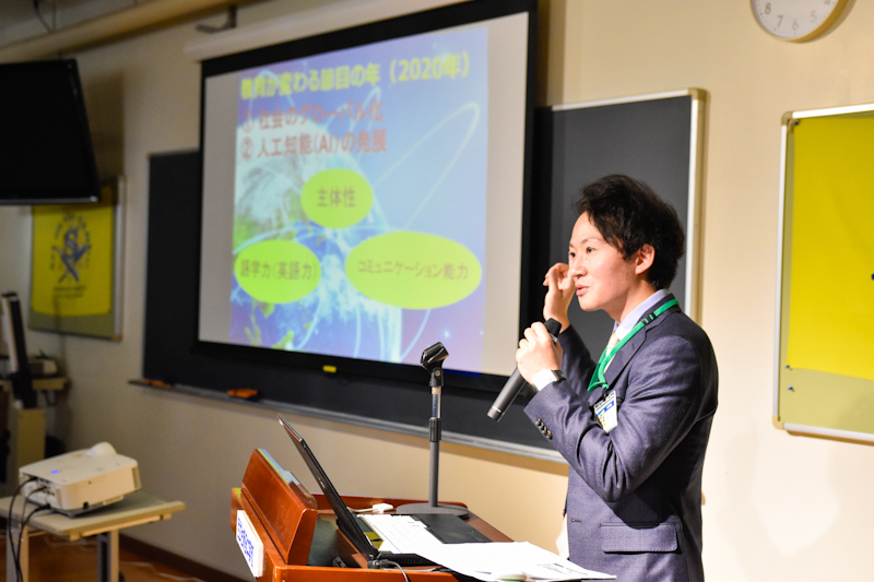 ICT教育主任・第1学年主任の河野からは、本校教育の特色でもある「西武台アクティブラーニング」についてお伝えしましたた。そのOUTPUTの部分であるプレゼンテーションを本校1学年の生徒に実践してくれました。
