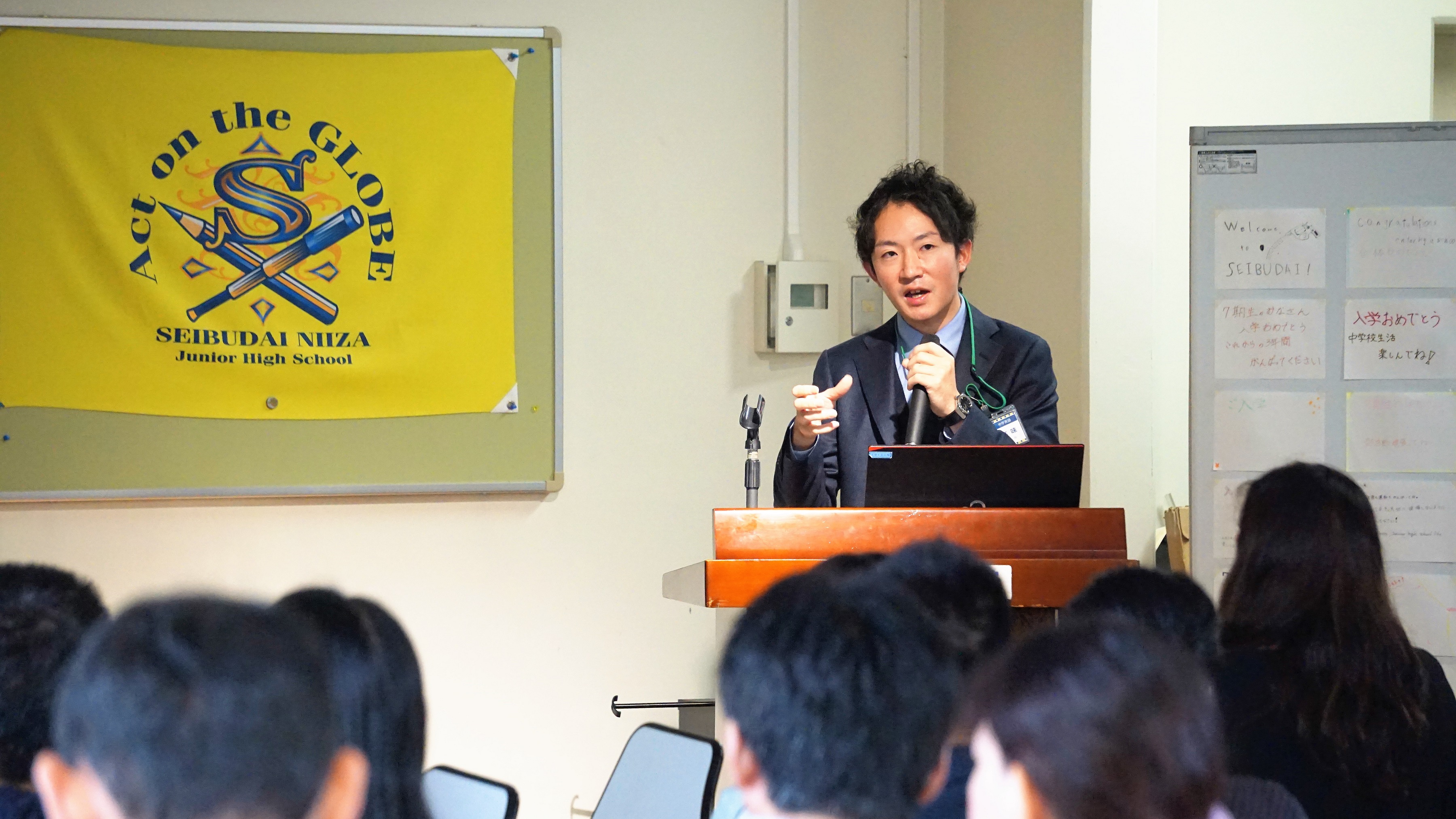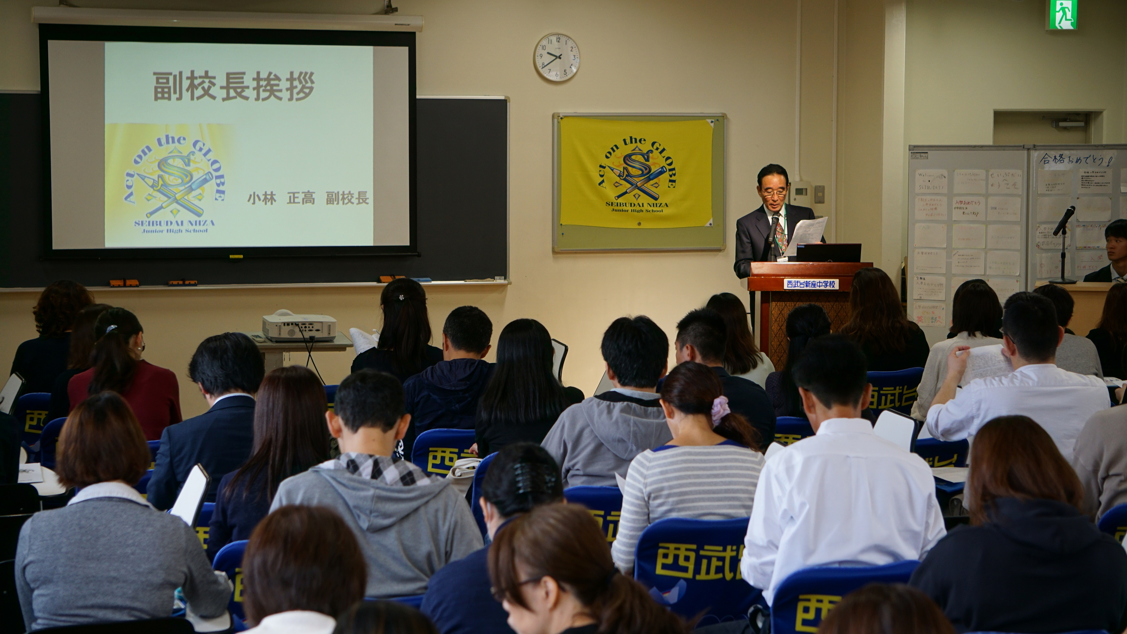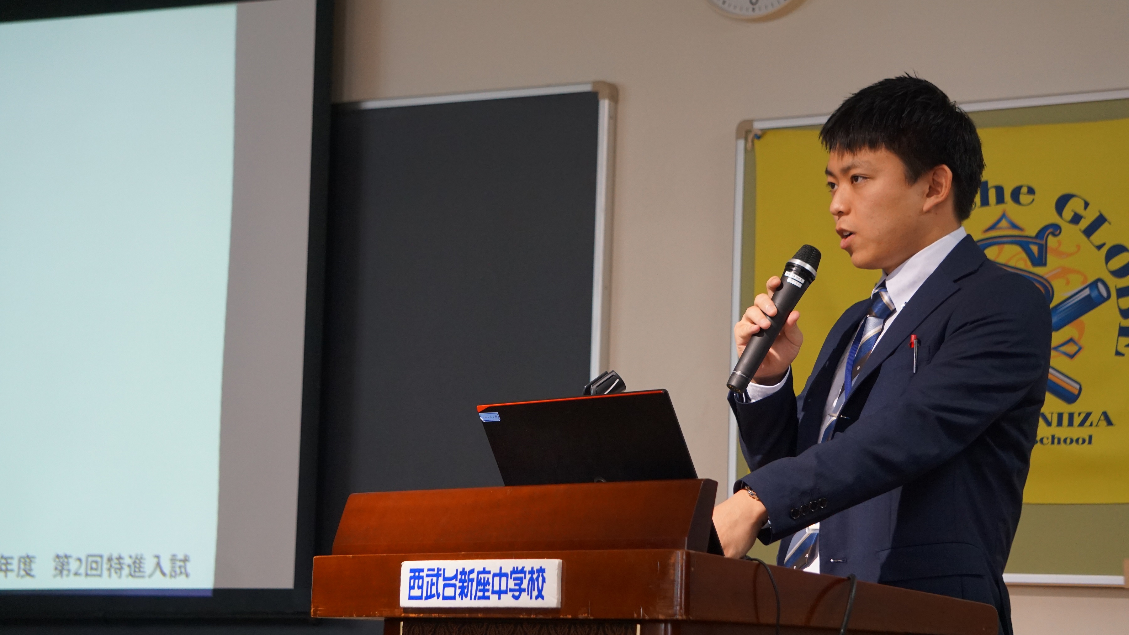 次に広報部高味教諭(英語)から、教育コンセプト、特に西武台式英語を取り挙げて英語を聞き取る力を鍛えていくためのトレーニングについてお話ししました。