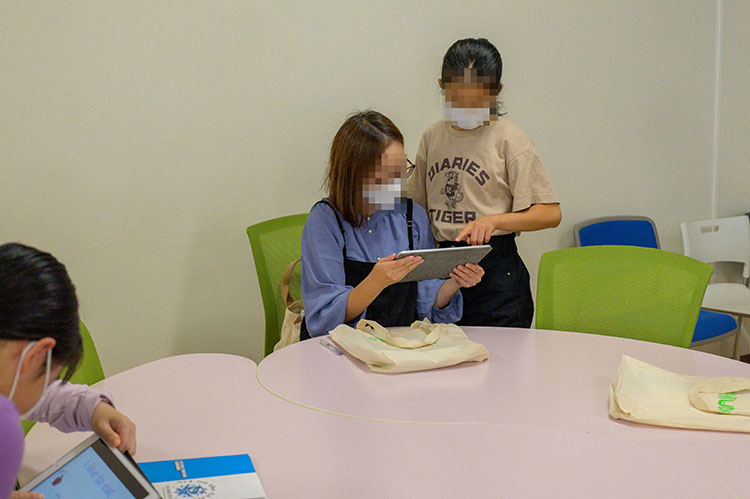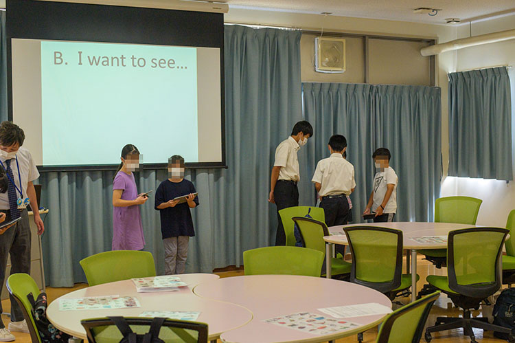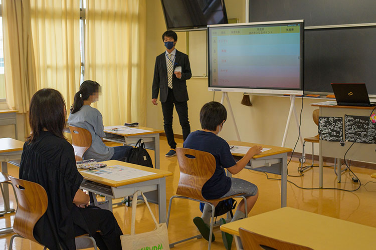 英語では、先日2年生が体験したイングリッシュグローバルキャンプで実施した内容のうち、一部を体験してもらいました。本校中学2年生も授業に参加し、児童や保護者の方々としっかりコミュニケーションをとっており、活気が溢れていました。