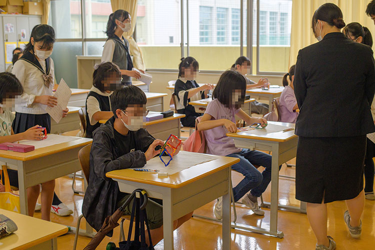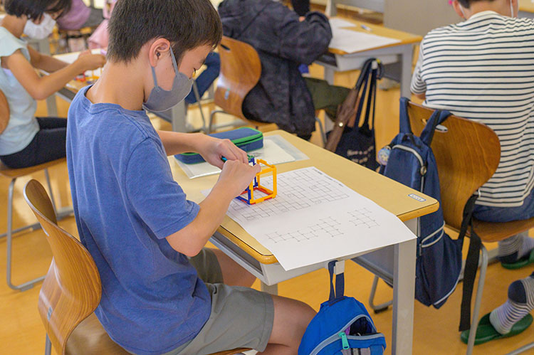 数学では「ポリドロン」と呼ばれるブロックを用いて展開図から立体を組み立てることをしていました。