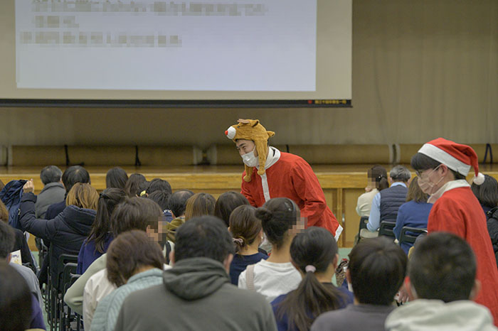 「きっと勝つ!!」という気持ちを込めてサンタクロースに扮した教員からキットカットの配布も行いました。