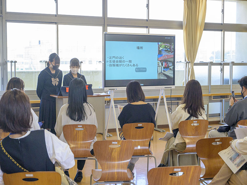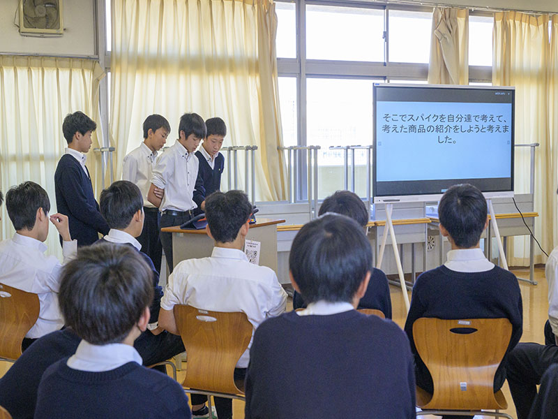 1年生の発表の様子。1年生は【生徒版学校説明会】として、西武台新座中学校をグループごとに深く調べ、学校紹介さながらのようにプレゼンテーションをしていました。学校の雰囲気や施設の紹介だけでなく、制服を実際に展示して説明しているグループもあり、ミニ学校説明会のような形になっていました。