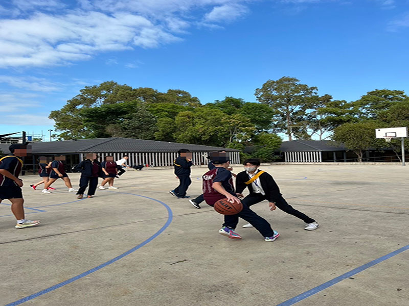 体育では、バスケットボールを現地生と一緒に実施していました。楽しそうにしている姿も見られました。