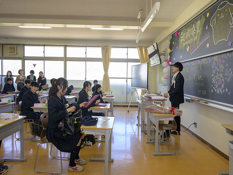 お別れ会の後、最後のHRが実施されました。3年間共にしたクラスメイト・担任の先生と中学校で過ごす最後の時間には涙を見せる生徒・担任もいました。ここまで3年生が成長してきたのは学校生活1つ1つの積み重ねが表れています。感動の卒業式が終わり、あと半月もすると入学式となります。新たな生活へ希望を胸に高校でも頑張ってほしいと思います。