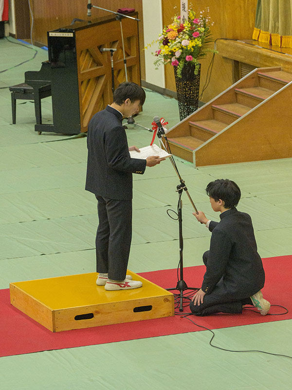 送辞と答辞はそれぞれ生徒会長・前生徒会長が行い、送辞では先輩方への感謝・激励を伝え、答辞では、これからの生活への期待と希望・感謝の言葉がありました。
