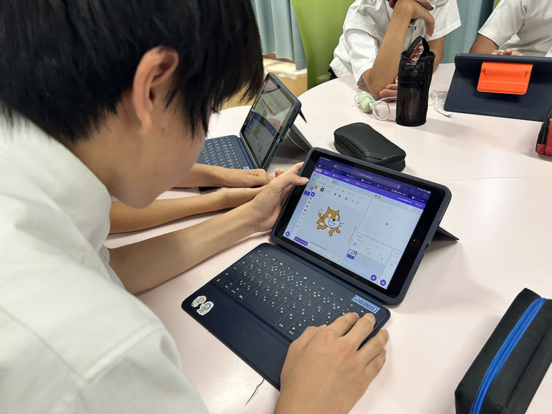プログラミング教室では、生徒の端末でスクラッチを入れて、実際にプログラムの作成・実行を体験してもらう形で授業が展開されています。