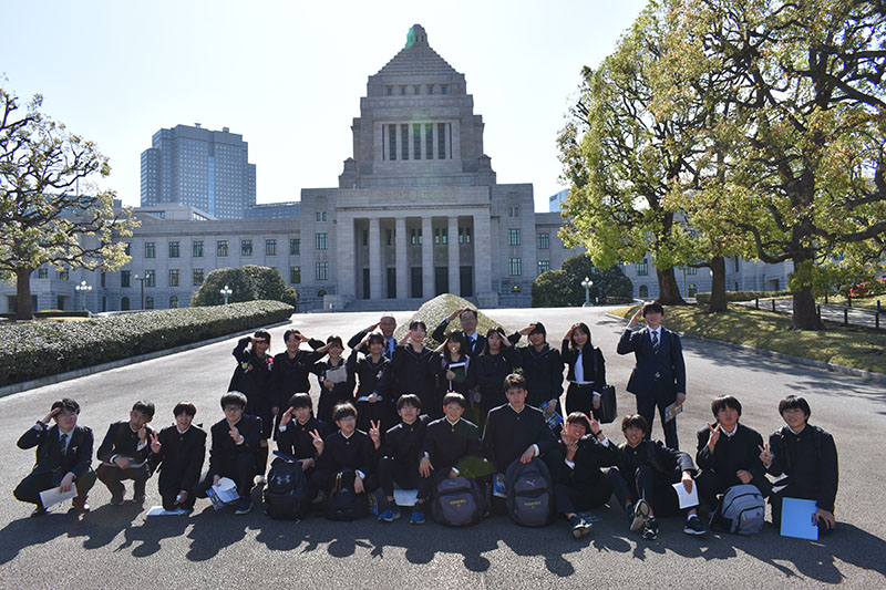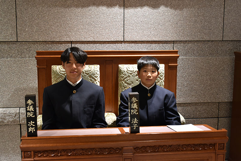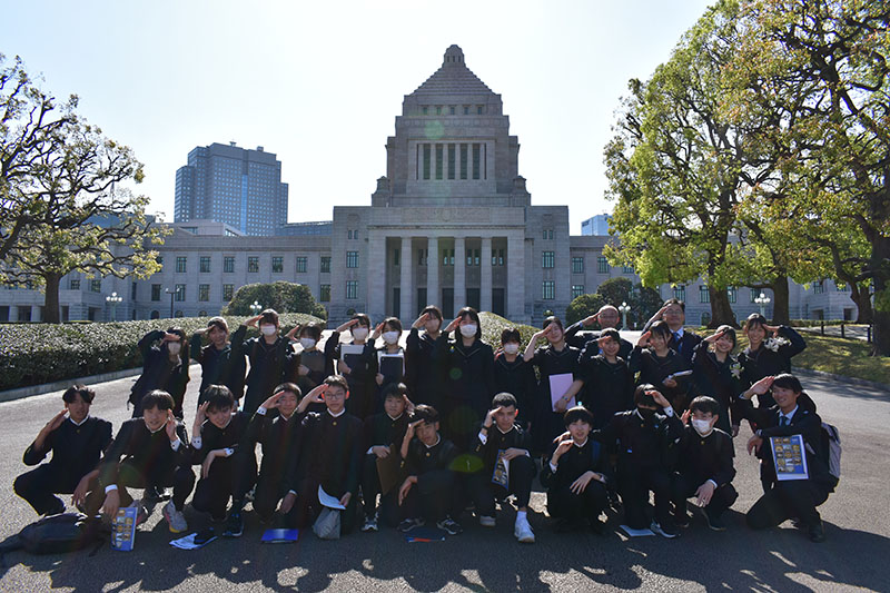 その後はゆりかもめで移動した後に、皇居・桜田門を巡りながら、二つ目の訪問先、国会議事堂へ! 3年生の社会科で学ぶ国会の内容を先取りしてきました! 実際の議席に座り、ウキウキの様子も! 政治の現場を目にしたことで、主権者としての自覚を持ってくれた生徒もいたようです。