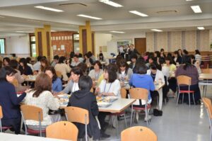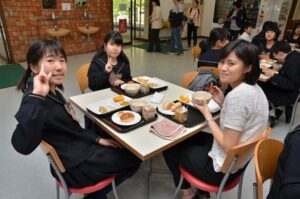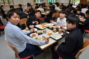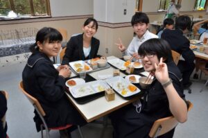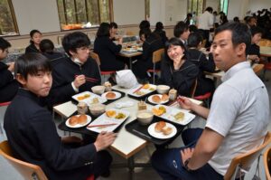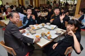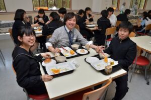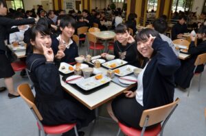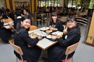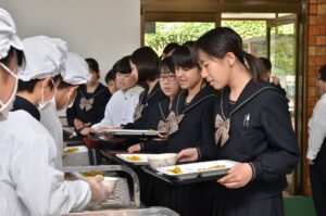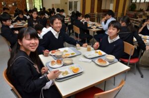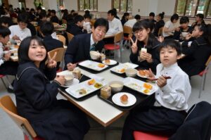 日頃生徒達が食べている給食を保護者の皆様にもご試食して頂く機会です。生徒たちはいつも通り、先生達と友達と楽しく給食を食べています。成長期の生徒たちに必要な栄養バランスを考えたおいしい給食を提供しています。