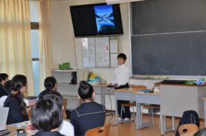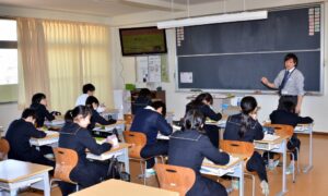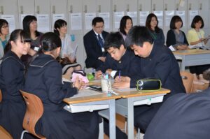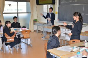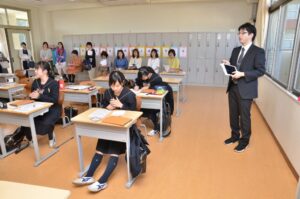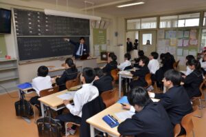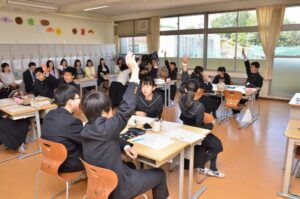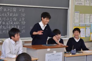 ICT機器を活用し、生徒達の理解度が高まるような教材を作成し授業を進めている様子です。とても丁寧な電子教材、板書で生徒たちの理解力も高まりテンポの良い授業風景でした。