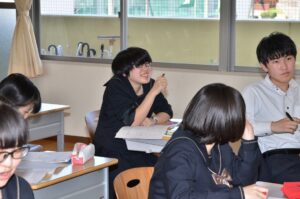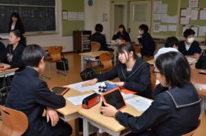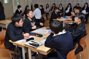ある題材(モラルジレンマ)に対して生徒達は自らと向き合い自分の考えを整理していきます。その後にグループに分かれ、最終的にはクラス全員と意見の交換をします。全国大会常連である英語部ディベートチーム監督のクラスとあって手法や議論の内容が濃い授業でした。