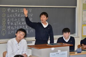 国語の授業の中で、題材に沿ったトピックを扱い論理的思考・多角的な視点・表現力などを身につける為に、ディベート的活動を取り入れいます。本校では部活以外にも社会科の授業などでも同様にディベートを扱っています(その際の様子は【こちら】からご覧頂けます)。