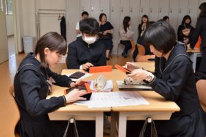 これまでに学習した語彙や文法事項を使い、iPadを用いて英語で自己紹介をしている様子です。入学して間もない生徒たちが英語の知識・技能とiPadの機器を使いこなしている素晴らしい授業風景を見る事ができました。