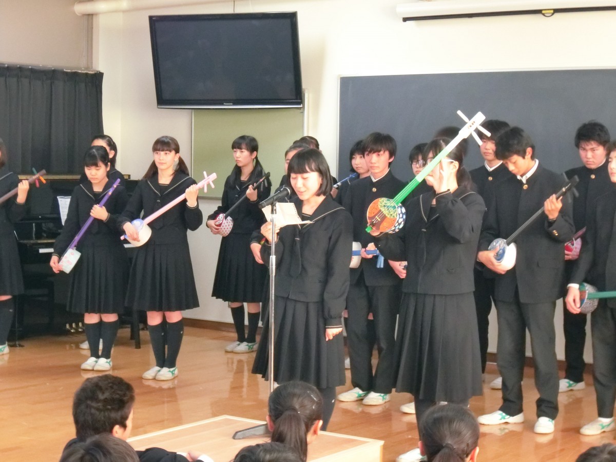 3年生は美術の時間で作成したカンカラ三味線で「涙そうそう」とRAINを合奏・合唱しました。