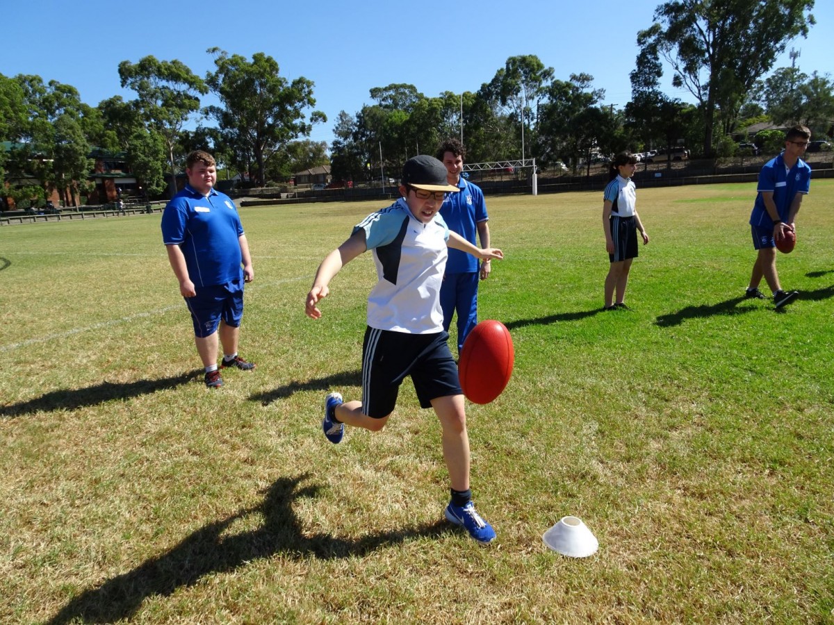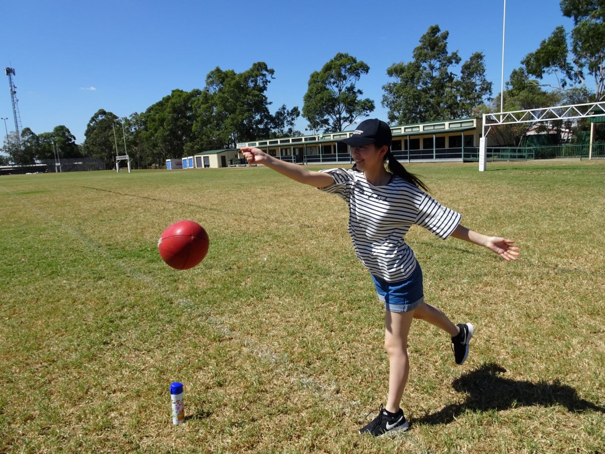 訪問期間が1日だけということもあり、セントドミニクス校では、本校の生徒たちのためにたくさんの企画が用意されていました。オーストラリアの伝統的な文化やスポーツを体験しようというテーマで、アボリジニ(オーストラリア先住民)の武器であるブーメランの装飾体験、オーストラリアンフットボール(通称オージーボール;ラグビーに似た球技)の体験をしました。本校の生徒たちは初めての経験に、ぎこちないながらも精一杯取り組んでいました。
