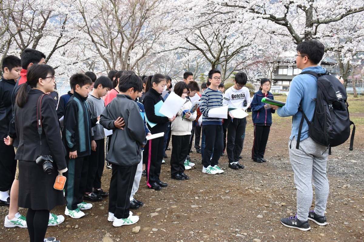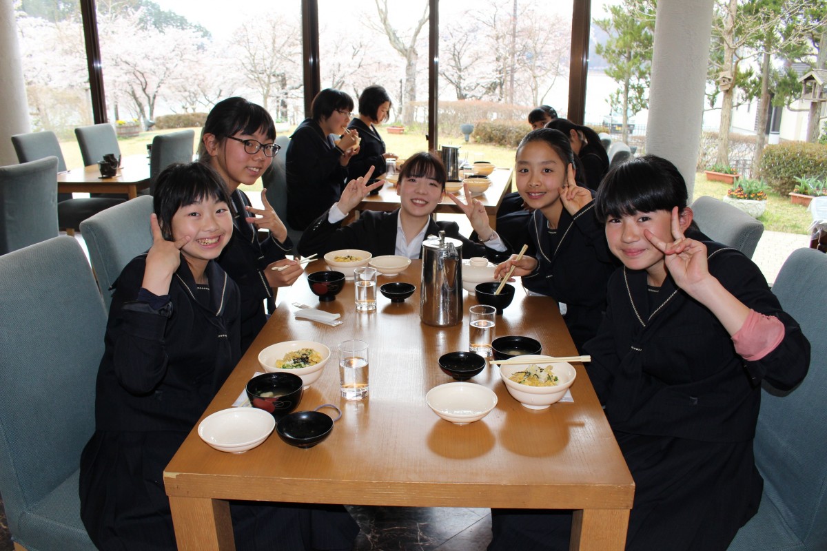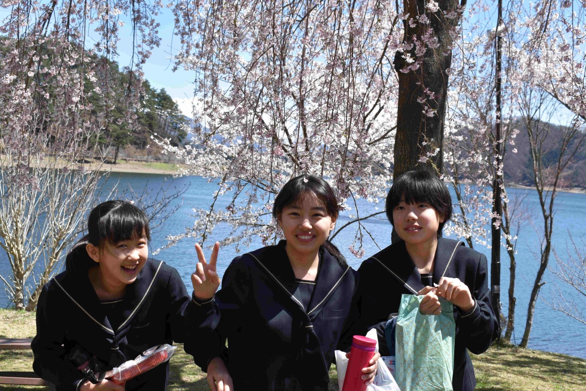 ホテルに到着後、みんなで満開の桜の下で昼食をとりました。