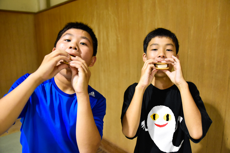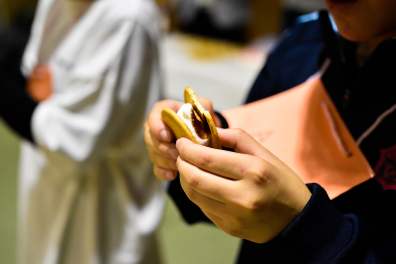 夕食後は”Camp Fire”の予定でしたが悪天候のため室内での活動となってしまいました。マシュマロを焼いてビスケットにサンドする予定でしたが、そのままで食べました。