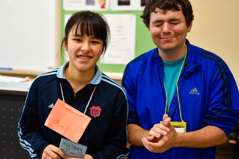 “My Story”(自分の自己紹介、友人の紹介などテーマを一つ選び英語で話す練習)では、何をどう話したら聞き手が面白いかを考えながら、ACと一緒に文章を考えていきました。