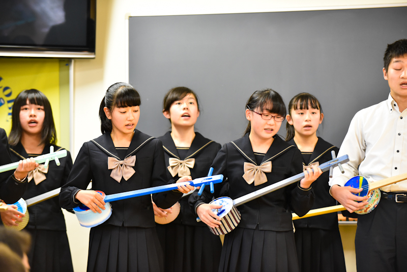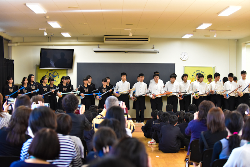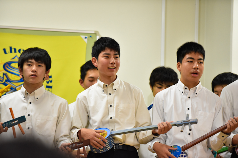 授業で三線を作成し、演奏に合わせて合唱を行っていました。