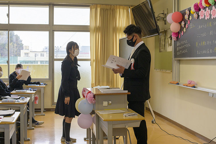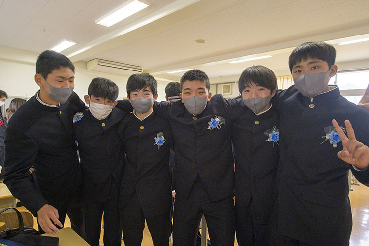 退場後、各クラスで最後の学活が始まり、各担任が作成した動画を放映したり、思い思いの言葉を述べたり、最後の写真撮影をしたりと最後の時間を楽しく過ごしていました。