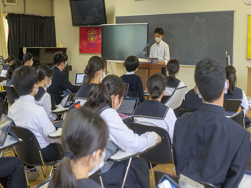 生徒総会の資料は全てiPadで配信されており、本校の総合的な学習の時間でも取り上げられている題材の1つのSDGsにおける17の目標の1つである「気候変動に具体的な対策を」にも関連しています。電子端末を有効活用してSDGsへの取り組みを実感することもできている生徒もいたはずです。