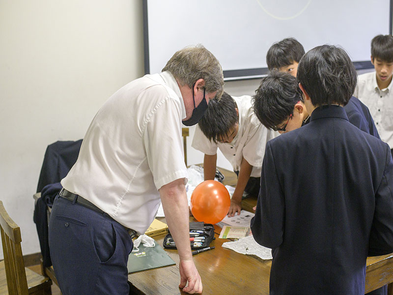 Science challengeでは、ストーリーのあるオリジナルアニメから、卵を割らないように地上約3階の建物から新聞と風船のみを利用して落としてみるという実験をしていました。卵が割れないようにどの班も創意工夫をしており、とても楽しんでいる様子が見えました。