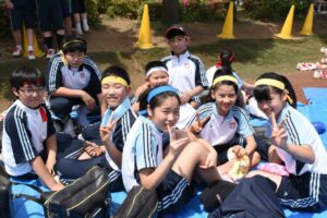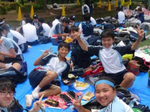 昼食はクラス、学年、中学校の皆、先生たちと一緒に食べます。午後の競技に向けてたくさん食べました。