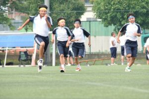 台風の目です。3年生が後輩をリードしながら行っています。1年生も先輩達に一生懸命ついていきます。内部進学生の高校生も頑張っています。