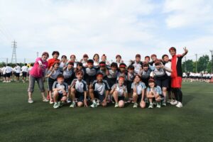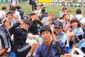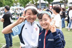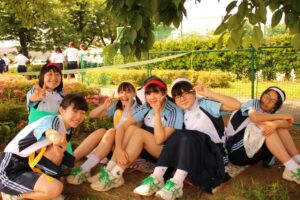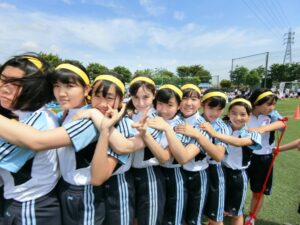 高校生の女子と一緒に中学生も色に分かれて玉入れに一緒に参加しました。お姉さんと一緒の組ではなかったですが、仲良く記念写真を撮りました。
