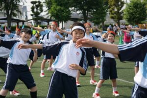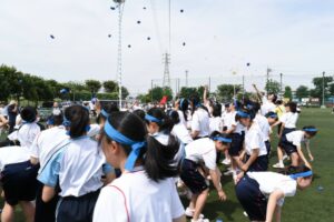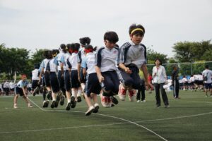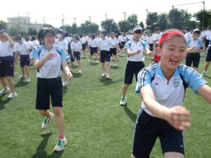 天候にも恵まれ、皆楽しそうに体育祭をむかえることができました。この後の競技に備え、しっかりと準備運動をします。