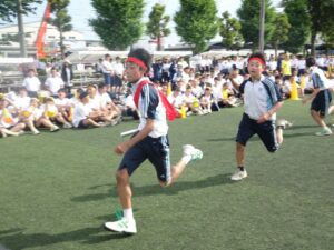 最後は最も盛り上がる色対抗のリレーです。先生達も参戦し、応援の人達にも力が入ります。