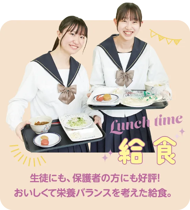 お昼はカフェテリアで給食を楽しみます。月曜日から金曜日の昼食時間は、生徒も先生もみんなでカフェテリアに集まって給食を楽しみます。育ち盛りの生徒のことを考えて量も十分、栄養バランスもきちんと管理したメニューです。女子生徒の声に応えてプチデザートの提供も行っています。