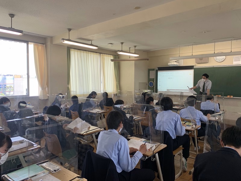 皆さんこんにちは!新入生の授業がいよいよスタートしました。今日は選抜Ⅰコースの様子をご紹介します。緊張しながらもしっかりと授業を受けています。新型コロナウイルス感染症対策への対応のためパーテーションを使用しての授業となります。